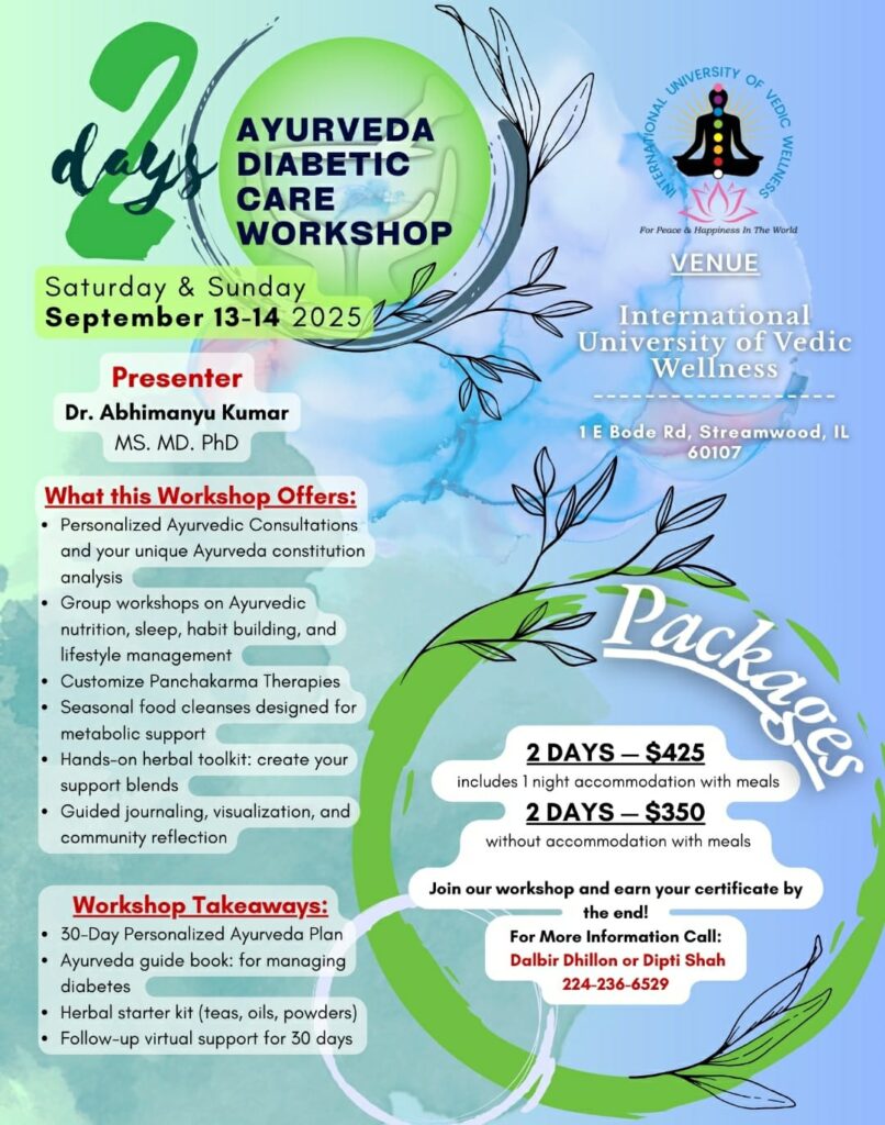 πΏ 2-Day Ayurveda Diabetic Care Workshop Learn holistic diabetes care with Dr. Abhimanyu Kumar (MS, MD, PhD) through Ayurveda nutrition, lifestyle, therapies, and hands-on herbal toolkits.